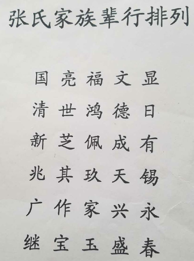 河南省信阳市商城县长竹园漆林冲张氏字辈:文如世发祥,德厚永辉煌,家声宜善守,恩泽庆延长。
